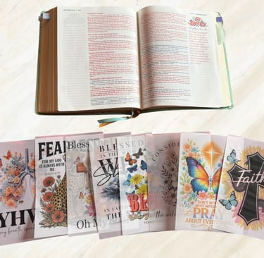 The designs go through a process before they become a finished tip-in — printed, cut, finished by hand. Each one is made with the intention that it will eventually land in someone's Bible and stay there. That it will mark a page that matters. That someone will flip to that passage on a hard day and find something beautiful waiting there that reminds them of something true.